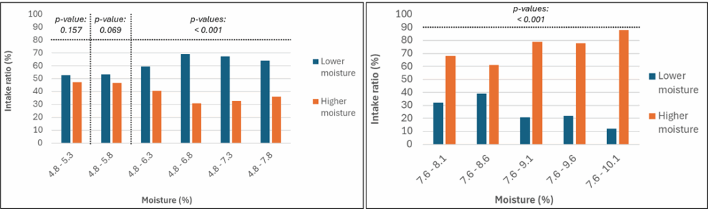 Figura 1. Efeito da umidade na palatabilidade para gatos (esquerda) e cães (direita).