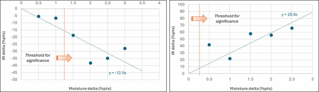 Figura 2 ilustra a correlação entre o delta da IR e o delta da MC. Uma clara correlação negativa é observada para gatos (esquerda) e uma positiva para cães (direita), reforçando as conclusões anteriores. O limiar de detecção situa-se entre 1 e 1.5% de MC para gatos e abaixo de 0.5% de MC para cães. Este último limiar não deve ser subestimado: 0.5% de MC é, na verdade, mais restrito do que a faixa de variabilidade típica até mesmo dos secadores industriais mais precisos. Isso sugere que os cães podem apresentar preferências diferentes dentro de um único lote de ração.